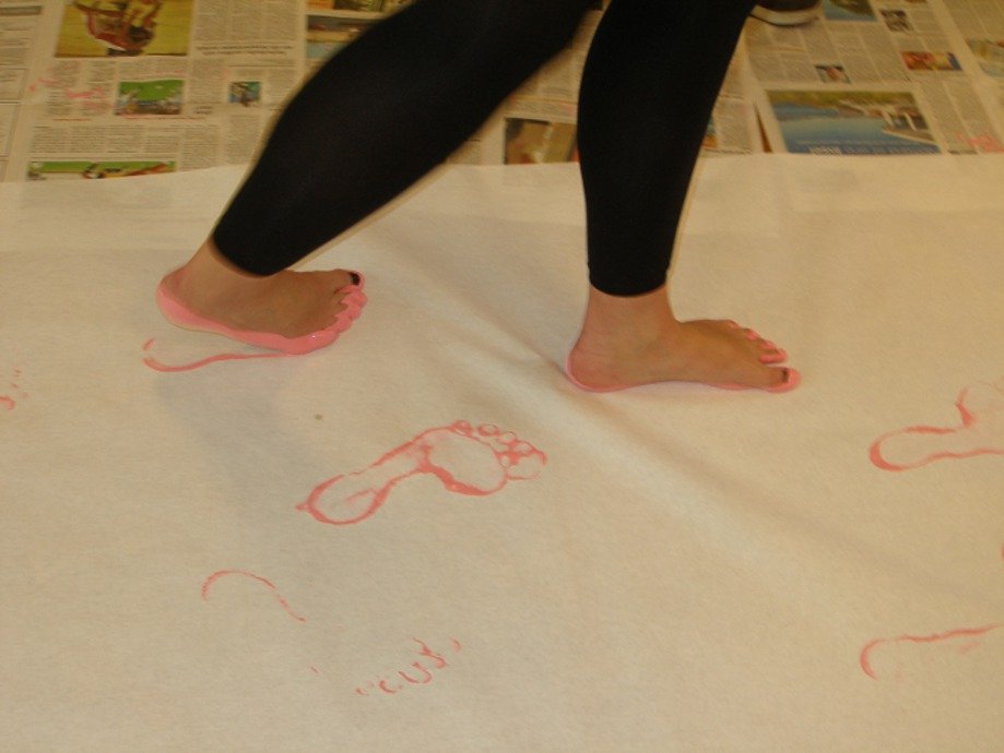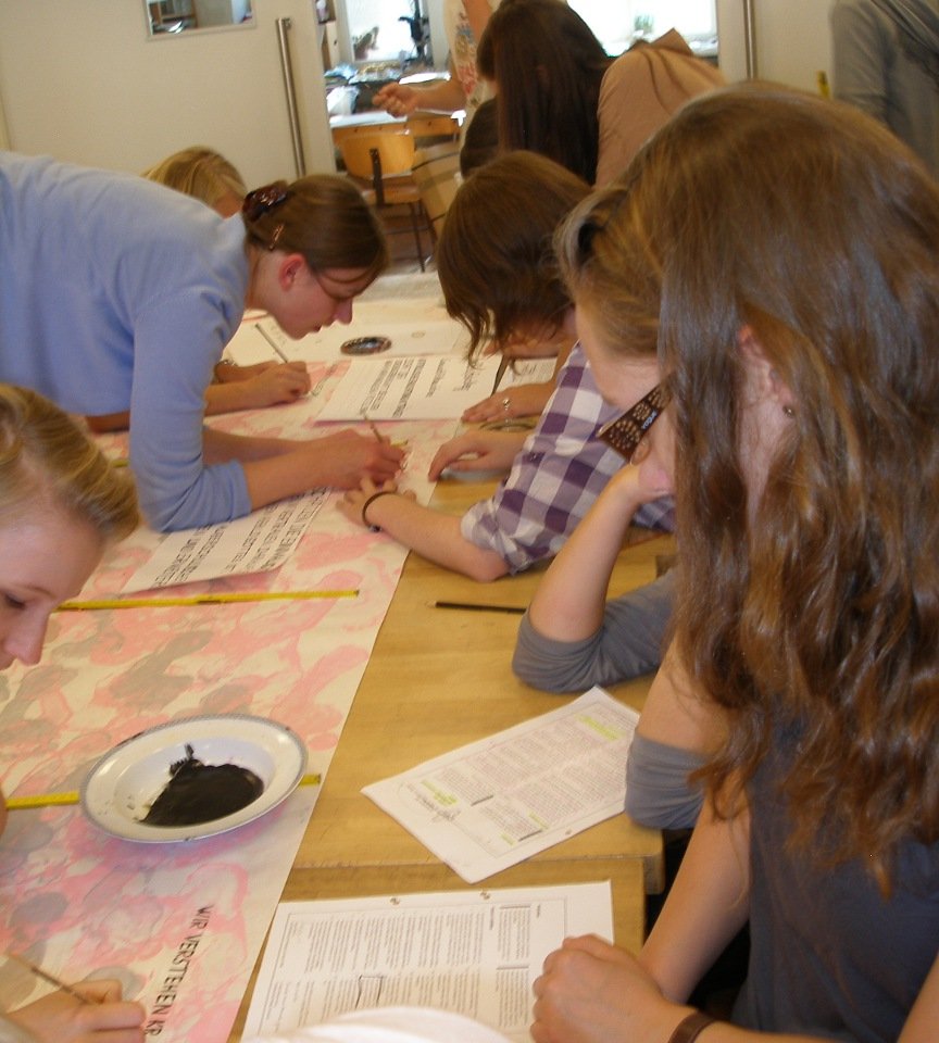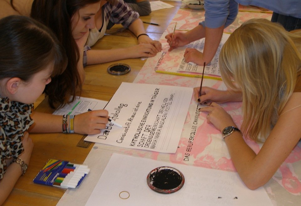 Dazu sollte es handschriftlich in der erlernten Blockschrift geschrieben werden und mit einem ansprechenden Layout für die Mitschüler/innen gestaltet werden. Während der Entwicklung des Layouts stellte sich heraus, dass der Text auf einem kleinen Format nicht die gewünschte Aufmerksamkeit erregen würde und zudem langweilig aussieht. Also wurde der Entwurf vergrößert. Allein die Vergrößerung des Formates brachte nicht den gewünschten Effekt. Schnell war man sich einig, dass Farbe in den Entwurf eingebracht werden sollte. Der gemeinsame Entschluss war es, sich auf die festgelegten Farben des Schulträgers zu beschränken, damit das Leitbild noch identitätsstiftender wird, außerdem wollte man verdeutlichen, dass ein Schulleitbild keine abgeschlossene Sache ist und dass es jeden Schüler, Lehrer oder Mitarbeiter auf seinem Weg in seiner Zeit am Berufskolleg und darüber hinaus begleitet. Das sollten Füße oder Schuhe versinnbildlichen. In einem Layoutwettbewerb wurde im Gestaltungstechnikunterricht ein Entwurf ausgewählt, der gemeinsam von allen verwirklicht werden sollte. Nach den umfangreichen Vorarbeiten stand die Klasse bald vor einer Papierbahn mit einen Länge von 4,50 Metern, die es galt zu gestalten. Mit viel Elan und Spaß wurde zunächst die Papierbahn mit bloßen Füßen und viel Farbe gestaltet, dann wurde von jedem Schüler und jeder Mitschülerin ein Abschnitt des Leitbildes Buchstabe für Buchstabe mit Blockschrift geschrieben. Dabei war Teamwork notwendig, damit es leichter fiel, die vorgegebenen Zeilen einzuhalten. Schließlich war es geschafft, die Rücken konnten gestreckt und die verkrampften Finger konnten gedehnt werden, das wahrscheinlich längste Schulleitbild war in gemeinsamer Arbeit mit gegenseitiger Unterstützung fertiggestellt, gemeinsam und mit gegenseitiger Unterstützung, ganz im Sinne des Leitbildes des Berufskollegs Canisiusstift Ahaus.