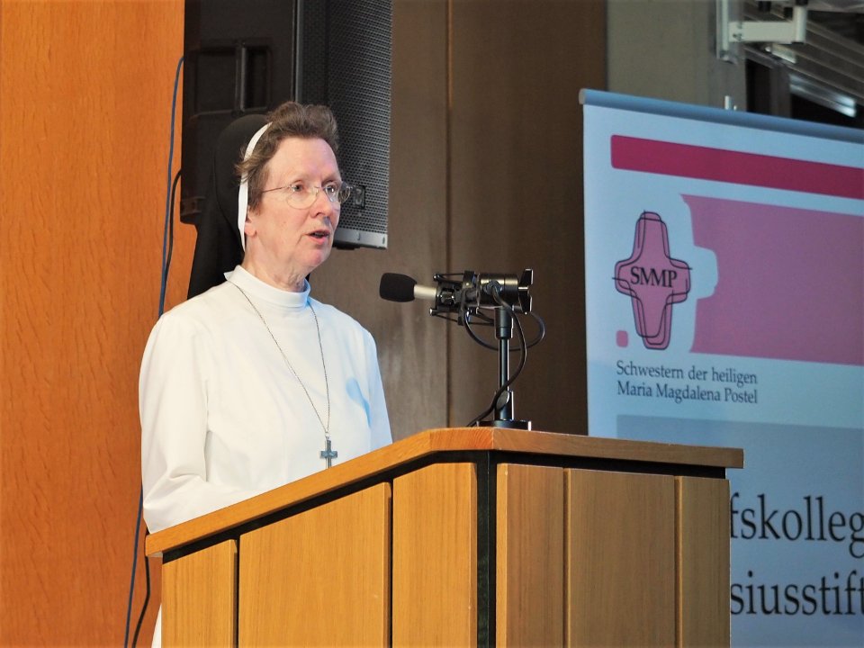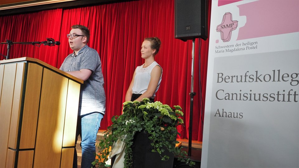 Gleichzeitig wurde hervorgehoben, dass es wieder viele besondere Leistungen am Berufskolleg Canisiusstift Ahaus gegeben habe. Als Berufskolleg in katholischer Trägerschaft der Schwestern der Heiligen Maria Magdalena Postel hat diese Schule nicht nur die Notenbesten im Blick. Allen wurden gratuliert und gedankt, die trotz Widrigkeiten durchgehalten haben oder über Umwegen einen längeren Weg zum Abschluss gegangen sind, denen, die das Beste aus sich herausgeholt haben, denen, die mit Spaß und Elan andere mitgerissen haben, denen, die immer zur Stelle waren, wenn es etwas zu tun gab, für einen Mitschüler/eine Mitschülerin, für die Klasse, für die Schule, denen, die sich außerhalb der Schule stark engagieren und ihr Pensum an der Schule trotzdem geschafft haben und vielen anderen mehr. Es gibt aber auch die, die während der Schulzeit zu der Einsicht und zum Entschluss gekommen sind, dass es für sie gut ist, andere Wege zu gehen. Sie begleiten die guten Wünsche aller.