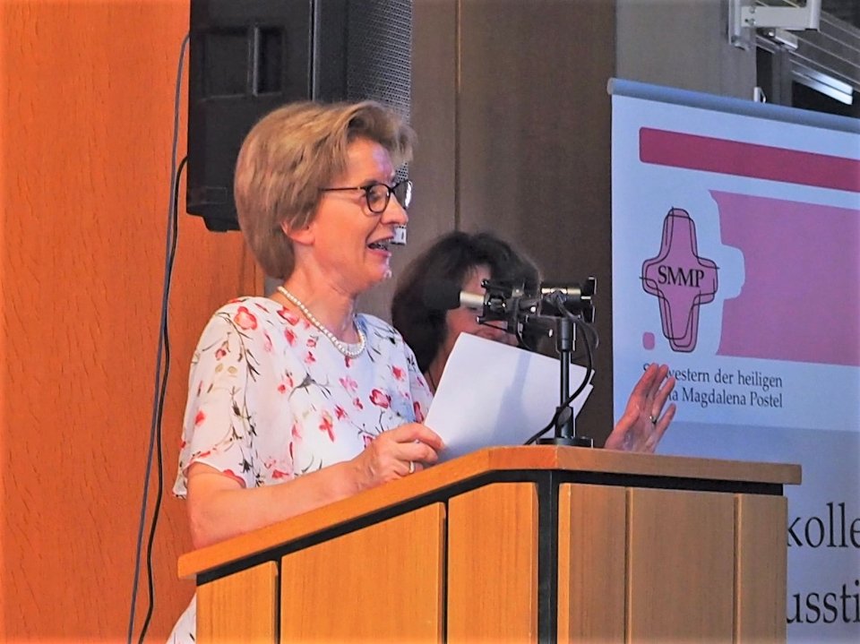 Zu Beginn der Feiern beglückwünschte Schwester Maria Manuela Gockel alle Absolventen ganz herzlich zu ihrem Abschluss und dankte allen, die die Feiern vorbereitet hatten, mitwirkten und sich engagiert hatten, dass die Abschlüsse gelingen konnten. Sie freute sich, dass an dem erstmalig vom Berufskolleg angebotenen Praktikum Erasmus+ mit Praktikumsstellen im europäischen Ausland 23 Absolventen teilgenommen haben. Zu ihrer weiteren Ansprache ließ sie sich vom Motto der Abschlussfeiern „ Ich geh´ meinen Weg“ und dem Bild auf dem Titelblatt des Programms und der Einladung inspirieren. Ein breiter Farbpinsel coloriert dort einen Weg, der weit ins Bild zum Horizont führt.