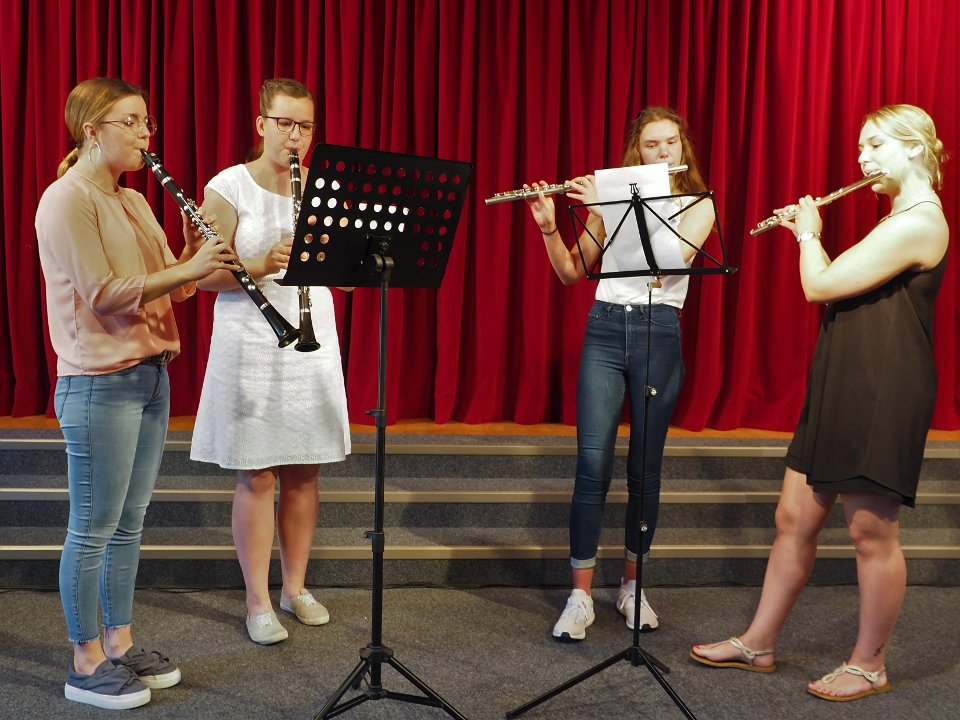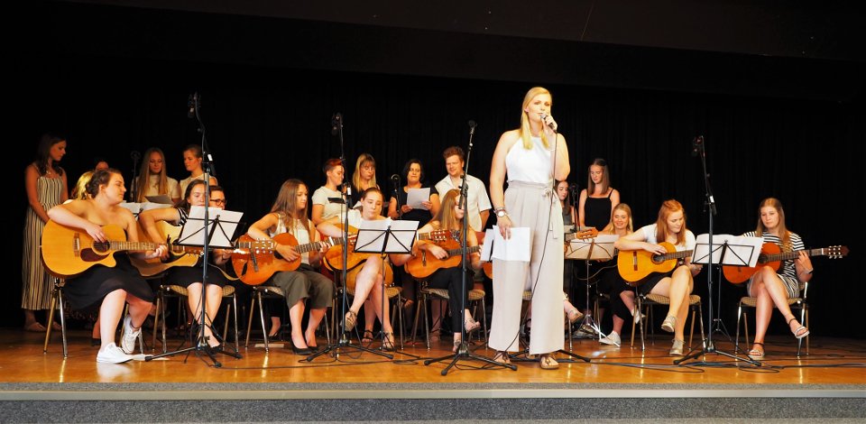 Einen stimmungsvollen Einstieg in die Abschlussfeiern gaben Kathrin Overkamp (Gesang) und die Gitarren-AG der FSP-O unter der Leitung ihrer Musiklehrerin Annette Niehues mit „Wir sind“ von W. Weiss sowie das Bläserquartett aus der AHE 12 mit „The Rose“ nach B. Midler und A. McBroom.