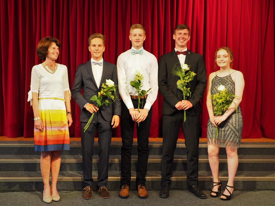 Vier Absolventen der gymnasialen Oberstufe wurden von der Schulleiterin Schwester Maria Manuela Gockel und der Abteilungsleiterin Dorothe Küster für ihre besonderen Leistungen gesondert geehrt. Jakob Terbrack (AHE 13B)schloss sein Abitur mit der Durchschnittsnote 1,3 , Lilly Bott (AHE 13A) mit der Note 1,4 , Sebastian Martschei (AHS 13) mit der Note 1,4 und Stefan Sieverding (AHS 13) ebenfalls mit der Note 1,4 ab.