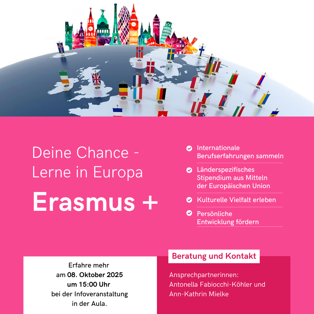 Am Mittwoch, den 08.10.2025, findet um 15:00 Uhr in der Aula eine Informationsveranstaltung zum Erasmus+ Programm statt.